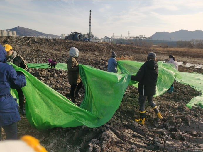寒冷絲毫沒有降低大家的熱情,路面因為每天噴灑防塵導(dǎo)致潮濕泥濘,大家穿上雨靴,爬上爬下,一鼓作氣,經(jīng)過兩天齊心協(xié)力的辛勤勞作,防塵網(wǎng)終于覆蓋完畢。遠遠望去,覆蓋綠網(wǎng)后的區(qū)域如同覆蓋了一片綠色植被。此次綠網(wǎng)覆蓋行動,不僅抑制了二次揚塵污染環(huán)境,保護了生態(tài)環(huán)境,同時達到了環(huán)境美化的效果。