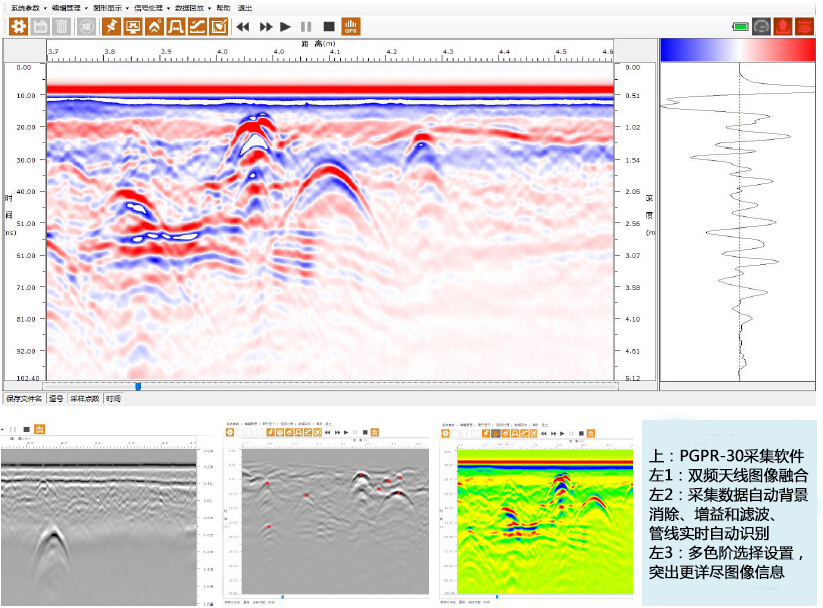 實時處理:背景去除,濾波,增益調節;自動管線識別;雙頻數據融合